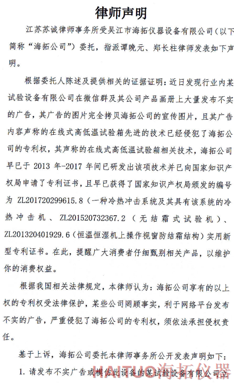 海拓儀器律師聲明:反對(duì)侵權(quán)行為 維護(hù)公司和消費(fèi)者權(quán)益摘要:國內(nèi)試驗(yàn)設(shè)備領(lǐng)先者吳江市海拓儀器設(shè)備有限公司委托律師事務(wù)所發(fā)布了律師聲明,該聲明指出,當(dāng)前市面上出現(xiàn)了產(chǎn)品專利侵犯海拓儀器權(quán)益,海拓儀器將以法律手段維護(hù)自身利益。該律師聲明要求某試驗(yàn)設(shè)備有限公司立即停止侵權(quán)行為,扯下其在網(wǎng)絡(luò)平臺(tái)的相關(guān)廣告和宣傳畫冊(cè)并同時(shí)停止生產(chǎn)同款設(shè)備。如果該設(shè)備公司不聽勸解,海拓儀器將向人民法院依法起訴該公司侵權(quán)行為,以維護(hù)自身合法權(quán)益和維護(hù)客戶消費(fèi)權(quán)益,并建議廣大消費(fèi)者仔細(xì)甄別相關(guān)產(chǎn)品。? ? ? ?近日,吳江市海拓儀器設(shè)備有限公司委托律師事務(wù)所發(fā)布了律師聲明,該聲明指出,當(dāng)前市面上出現(xiàn)了產(chǎn)品專利侵犯海拓儀器權(quán)益,海拓儀器將以法律手段維護(hù)自身利益。??事件源起于海拓儀器發(fā)現(xiàn)市面上有同類設(shè)備公司通過完全拷貝海拓儀器產(chǎn)品宣傳圖片,在微信群及該公司產(chǎn)品畫冊(cè)上大量發(fā)布不實(shí)廣告。??聲明指出,該廣告聲稱的在線式高低溫試驗(yàn)箱的技術(shù)侵犯了海拓儀器的專利權(quán),該產(chǎn)品專利由海拓儀器