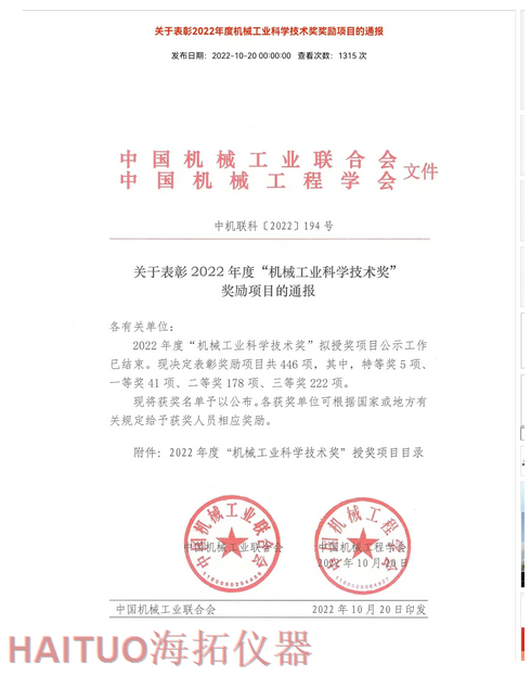海拓儀器榮獲2022年度中國機(jī)械工業(yè)科學(xué)技術(shù)獎(jiǎng)?ICC訊?10月20日,2022年度“中國機(jī)械工業(yè)科學(xué)技術(shù)獎(jiǎng)”項(xiàng)目名錄正式發(fā)布,由海拓儀器(江蘇)有限公司完成的“超快速冷熱沖擊試驗(yàn)系統(tǒng)關(guān)鍵技術(shù)研究與系列應(yīng)用”項(xiàng)目榮獲2022年度“中國機(jī)械工業(yè)科學(xué)技術(shù)獎(jiǎng)”三等獎(jiǎng)。??據(jù)了解,中國機(jī)械工業(yè)科學(xué)技術(shù)獎(jiǎng)是根據(jù)《國家科學(xué)技術(shù)獎(jiǎng)勵(lì)條例》和《社會(huì)力量設(shè)立科學(xué)技術(shù)獎(jiǎng)管理辦法》的有關(guān)規(guī)定,由中國機(jī)械工業(yè)聯(lián)合會(huì)和中國機(jī)械工程學(xué)會(huì)共同設(shè)立并經(jīng)國家科學(xué)技術(shù)部批準(zhǔn),在國家科技獎(jiǎng)勵(lì)主管部門登記的面向全國機(jī)械行業(yè)的綜合性科技獎(jiǎng)項(xiàng)。旨在表彰在機(jī)械工業(yè)科技工作中作出突出貢獻(xiàn)的單位和人員,獎(jiǎng)勵(lì)范圍包括:機(jī)械工業(yè)科學(xué)技術(shù)發(fā)明成果、機(jī)械工業(yè)科學(xué)技術(shù)進(jìn)步成果、機(jī)械工業(yè)工程化和新技術(shù)推廣成果和機(jī)械工業(yè)軟科學(xué)和標(biāo)準(zhǔn)成果。??海拓儀器是一家集研發(fā)、制造、貿(mào)易于一體高科技現(xiàn)代化公司,公司成立于2005年,主要產(chǎn)品包括:超快速冷熱沖擊試驗(yàn)機(jī)(熱流儀)、快速溫變應(yīng)力篩選試驗(yàn)箱(ESS),